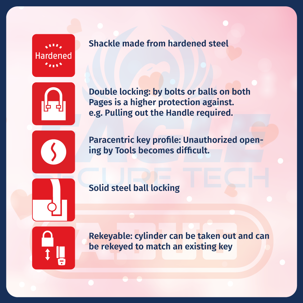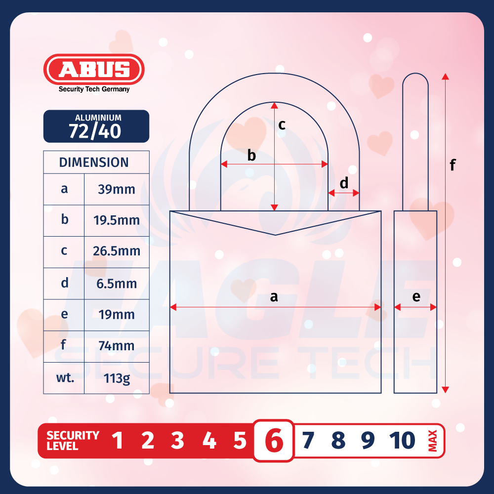 ABUS aluminum locks are also suitable for other applications – ideal for individual security and with a high recognition value thanks to intense colors. The Love Lock 72 padlock secures doors, gates, cupboards, lockers, tool boxes, cellars, sheds, switchgears, etc. The colored lock body made of aluminum is protected against corrosion and is complemented by a hardened shackle. With the lock number on the key, you can easily create additional keys.