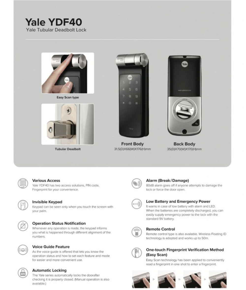 Yale YDF40 has two access solutions, PIN Code or Fingerprint for your convenience.